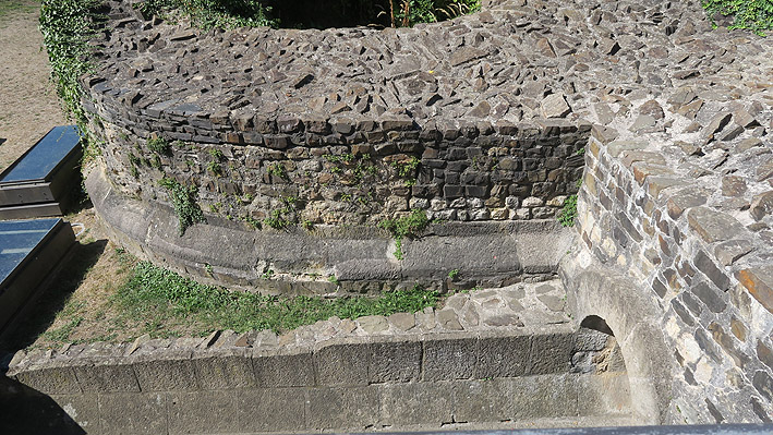Römische Turmreste sind im Rundgang sichtbar vom Angert aus links vom evangelischen Pfarrhaus, hier auch mittelalterliche Außensanierung ![]() Hier sieht man große Steinblöcke in Zweitverwendung, z.B. von alten Grabmonumenten und darunter römisches Mauerwerk. ![]() Die schräg stehenden Steine wurden wohl mit zu festem Mörtel verbunden, der nicht flüssig genug war, um in die Fugen ganz einzusickern. Schlampige Arbeit gab es schon immer! ![]() hier war der Mörtel